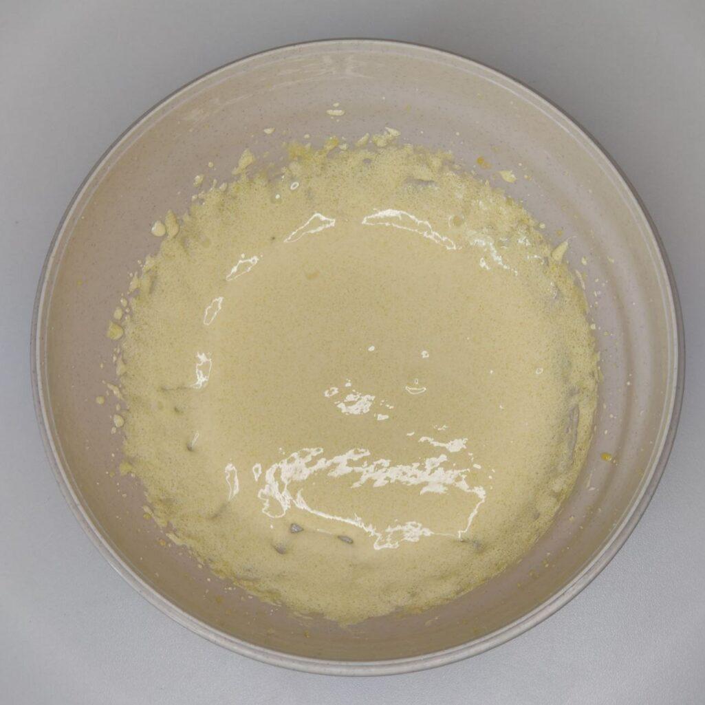 1. Готовим опару. В чашке смешать сыворотку, дрожжи, 2 ст. л сахара (от общей массы) и 7 ст. л муки (от общей массы). Накрыть и оставить на 40 минут.