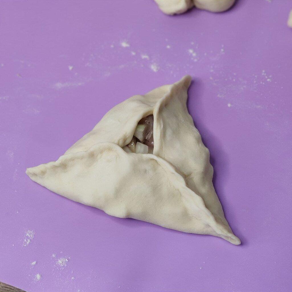 4. В центр выложить начинку и с трёх сторон подогнуть края к верху так, чтобы курник получил треугольную форму, но в центре при этом должно остаться отверстие.
